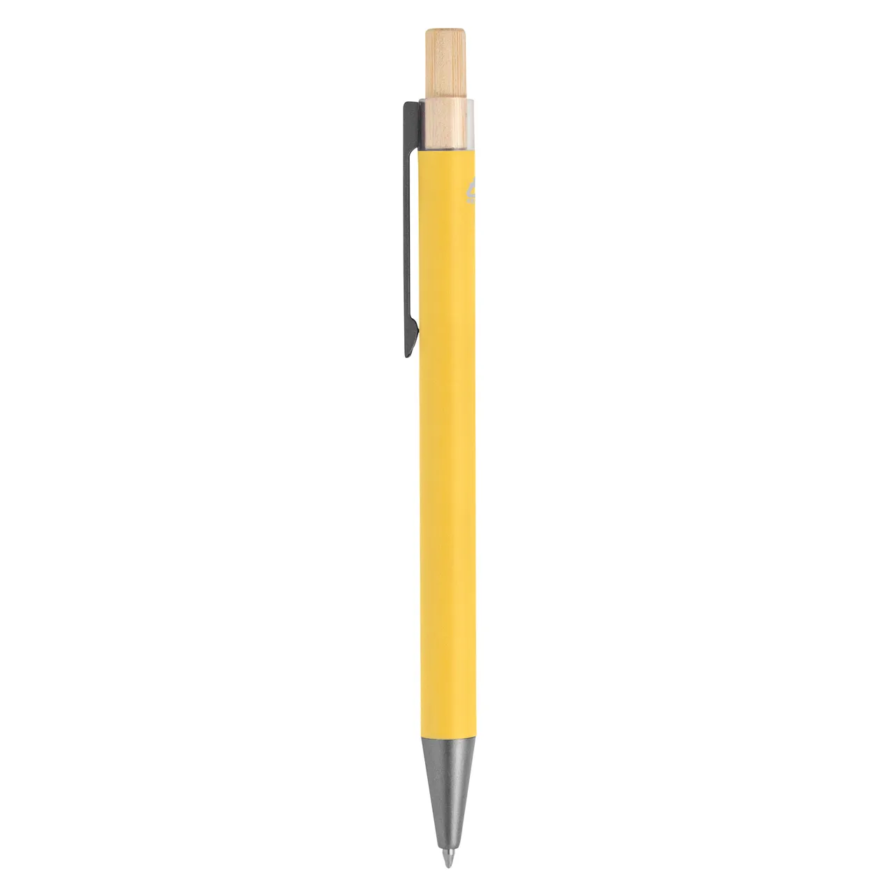 Elegancia y sostenibilidad. Bolígrafo retráctil. Cuerpo metálico en diferentes colores acabado mate. Clip metálico y puntera plástica color gris acabado mate. Pulsador de bambú.Medidas: 14 cm.