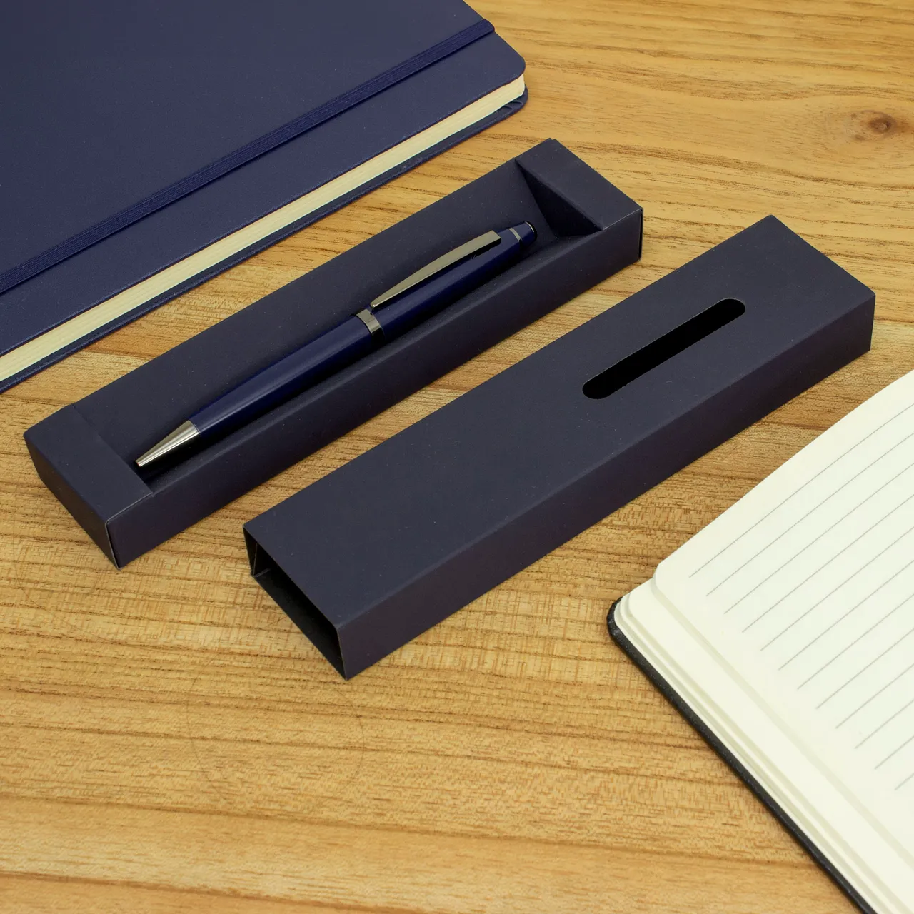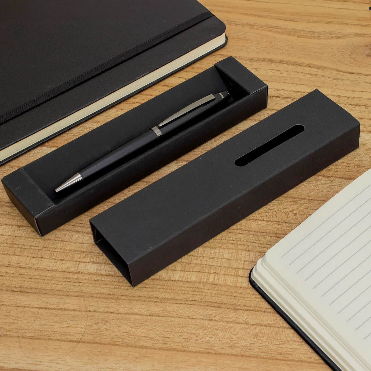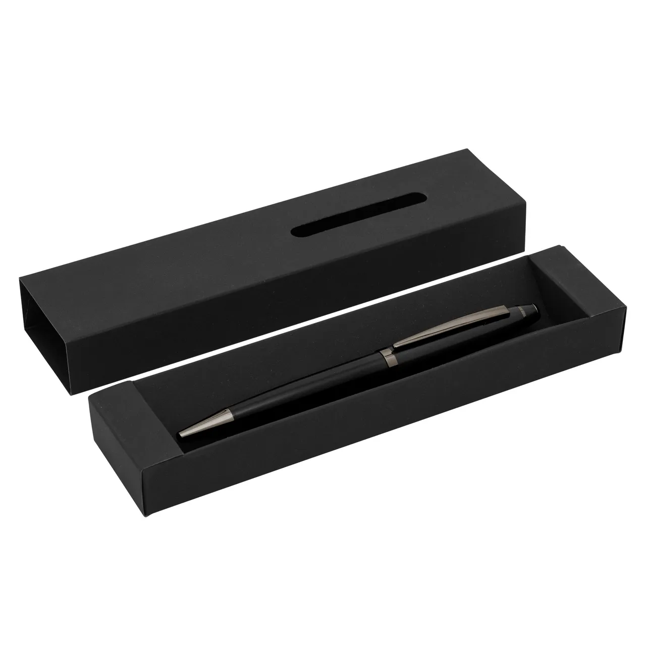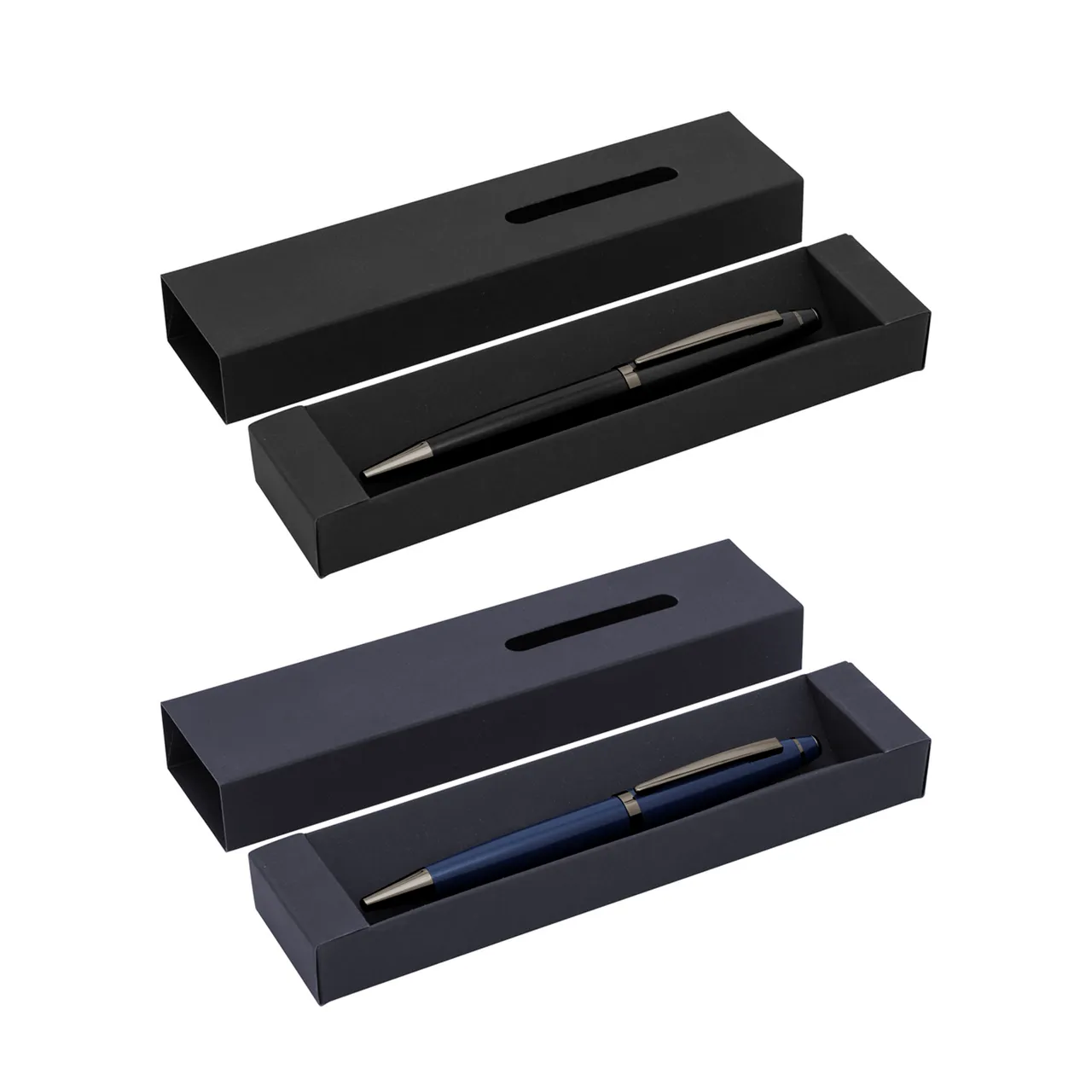 Presentación: en caja de regalo con ventana y acabado engomado del color del bolígrafo.