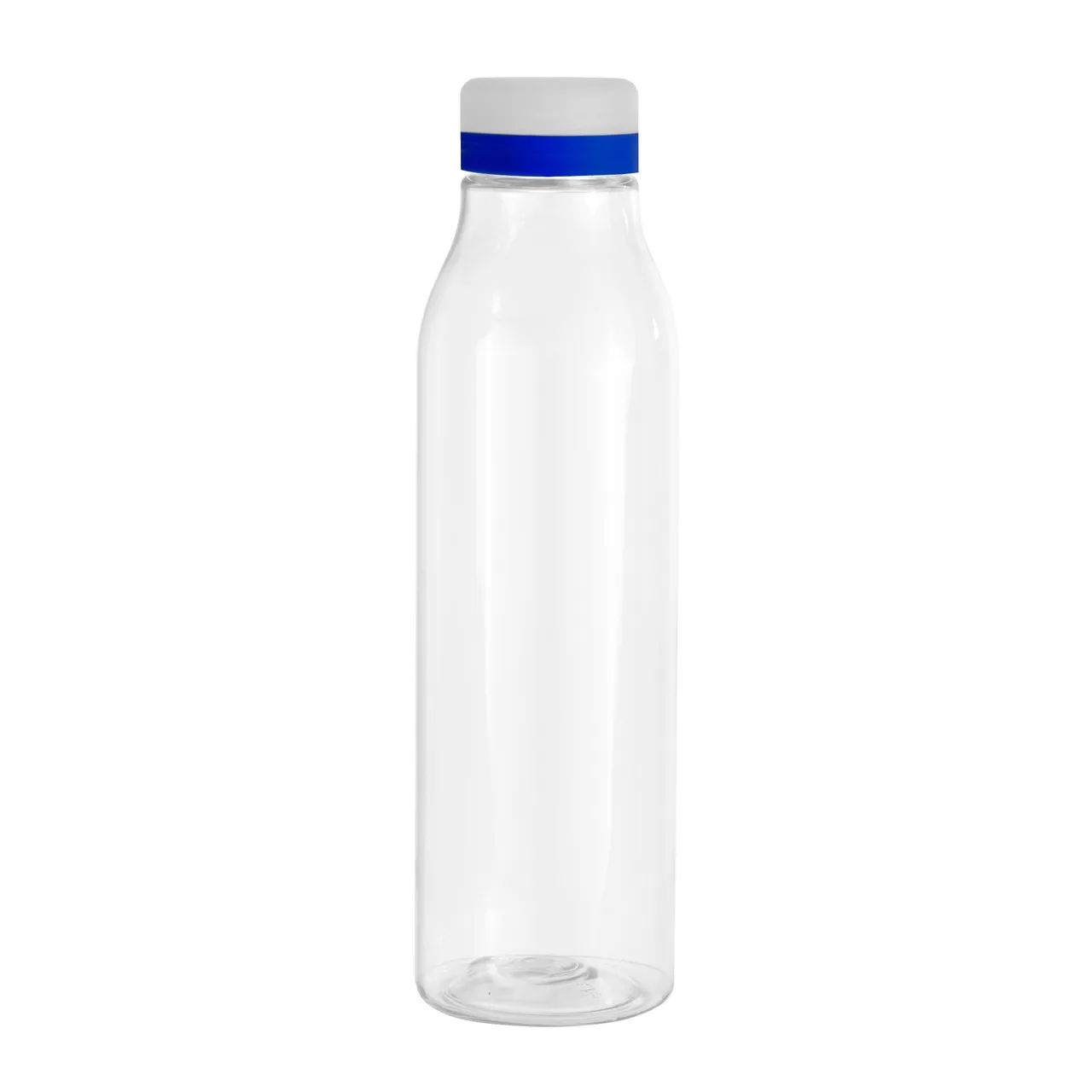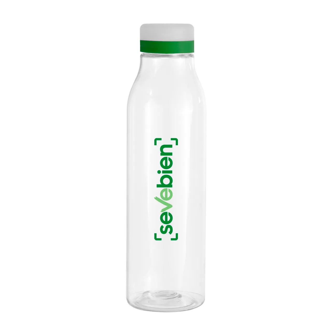 Frescura a tu lado.Botella de plástico transparente con tapa a rosca esmerilada con anillo de silicona de diferentes colores.Medidas: Ø 7 x 24,5 cm.