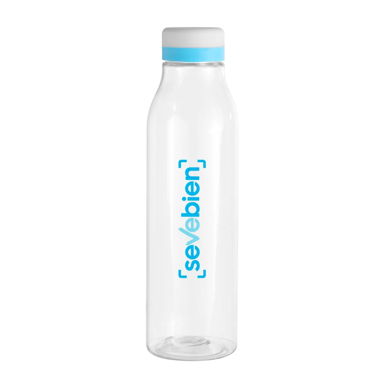 Ligera y Duradera.Botella de plástico transparente con tapa a rosca color blanco mate con anillo de silicona de diferentes colores.Medidas: Ø 7 x 24,5 cm.