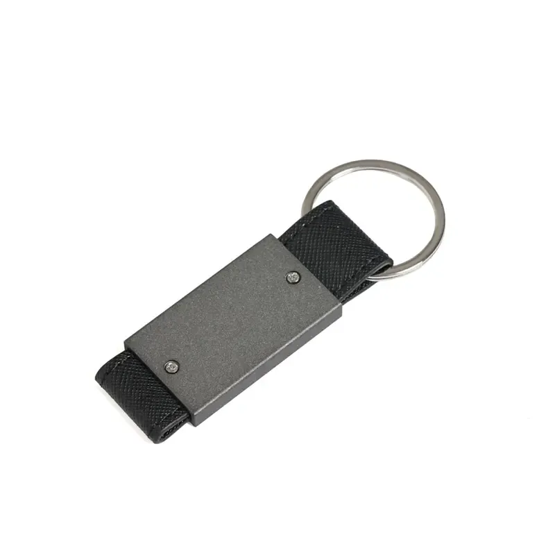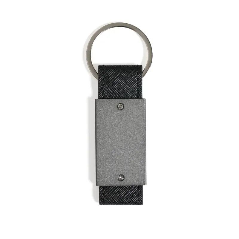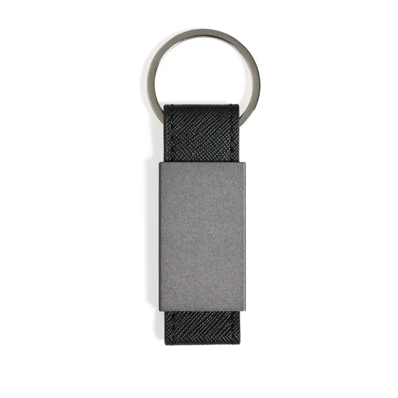 Llavero liviano fabricado en aleación de aluminio con detalles en PU y anillo de hierro. Cuenta con cuerpo metálico rectangular, cinta reforzada y anilla resistente para una sujeción segura. Es ideal para quienes buscan un llavero práctico, elegante y duradero para llevar sus llaves de forma organizada.