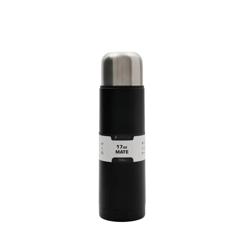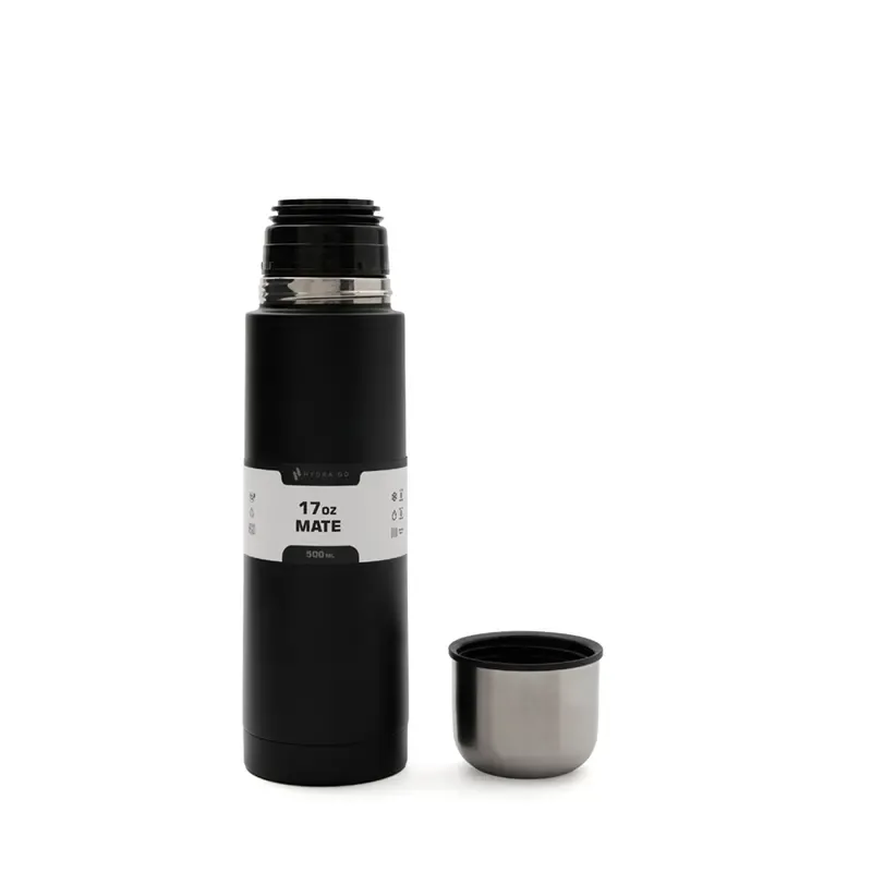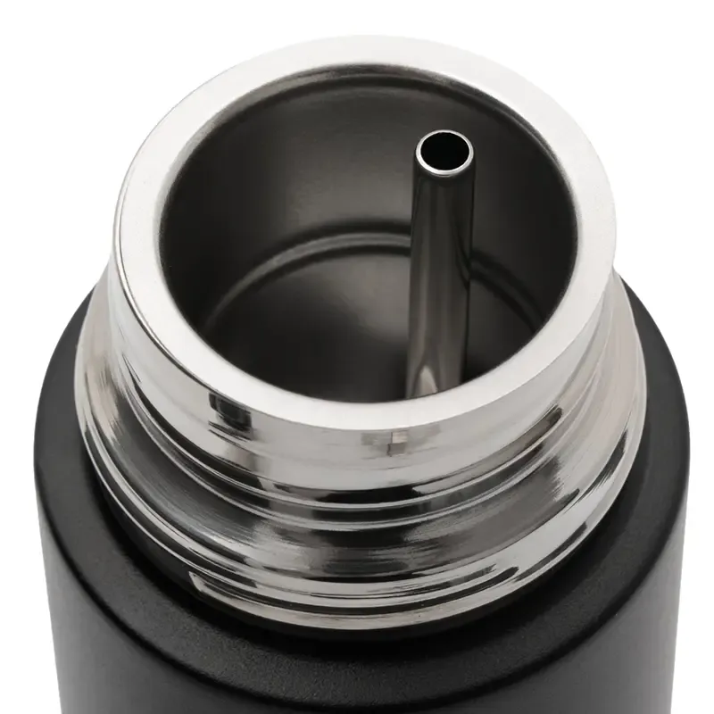 Mate listo de acero inoxidable de doble pared, fabricado en acero 304 con acabado powder coated color negro. Cuenta con bombilla incorporada de acero desmontable, tapa con rosca de acero inoxidable y cuerpo térmico que mantiene la temperatura. Es ideal para tomar mate de forma práctica y moderna, tanto en el trabajo como al aire libre, sin necesidad de llevar accesorios adicionales.