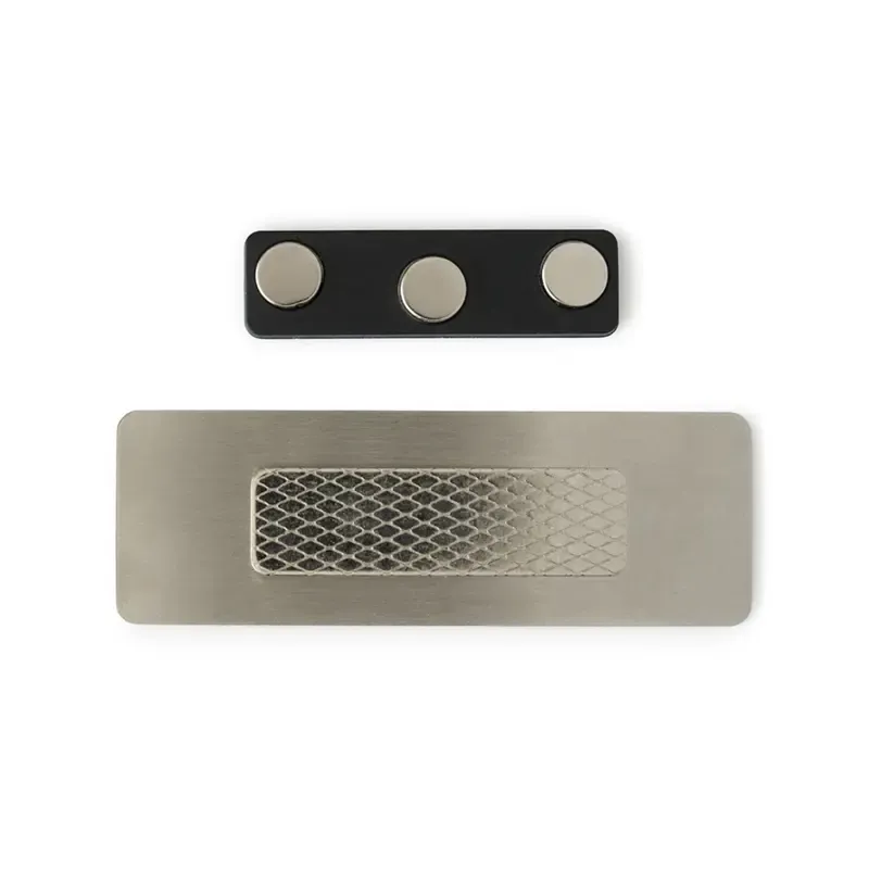 Name tag fabricado en acero inoxidable 201 combinado con imán y ABS. Cuenta con sistema magnético de sujeción. Es ideal para identificación profesional en empresas, hoteles y eventos corporativos