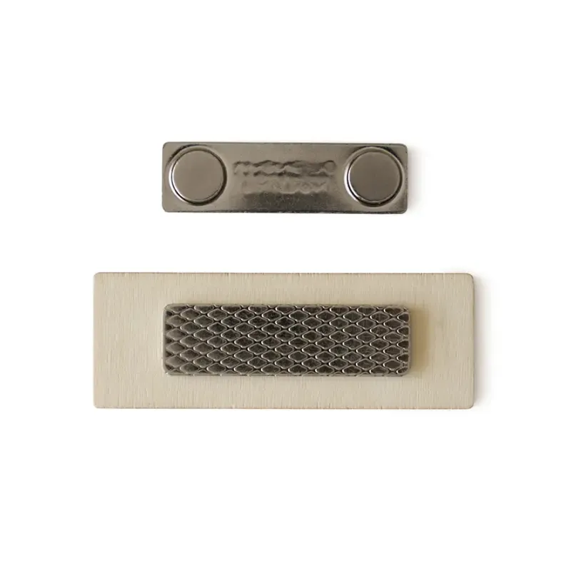 Name tag de madera fabricado en plywood combinado con imán y ABS. Cuenta con sistema magnético de sujeción. Es ideal para identificación corporativa en eventos, ferias y atención al cliente