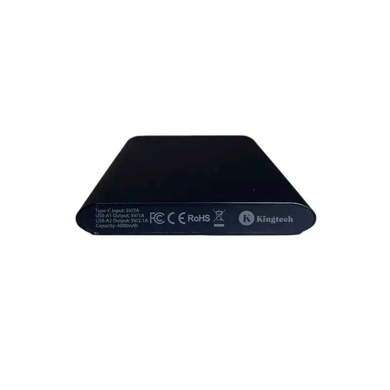 Cargador portátil ultradelgado fabricado en aluminio con batería de polímero de litio. Cuenta con dos salidas USB-A y entrada Tipo-C de 5V/2A (10W), incluye cable USB-A a USB-C y posee indicador LED para monitoreo de carga. Es ideal para quienes buscan un accesorio liviano y sofisticado para cargar hasta dos dispositivos en simultáneo, perfecto para el trabajo, viajes o uso diario.