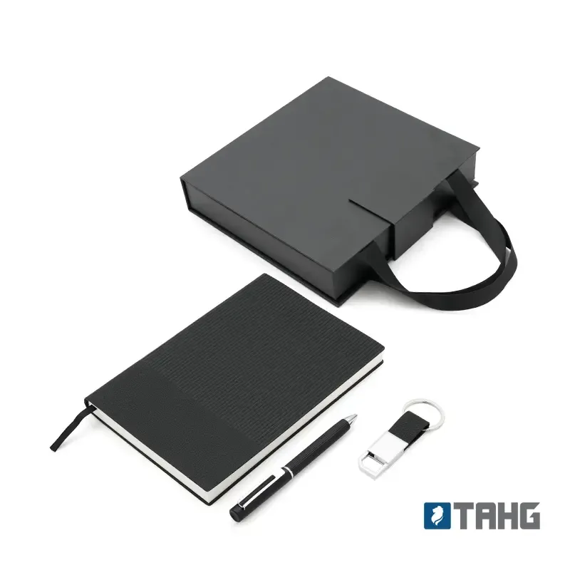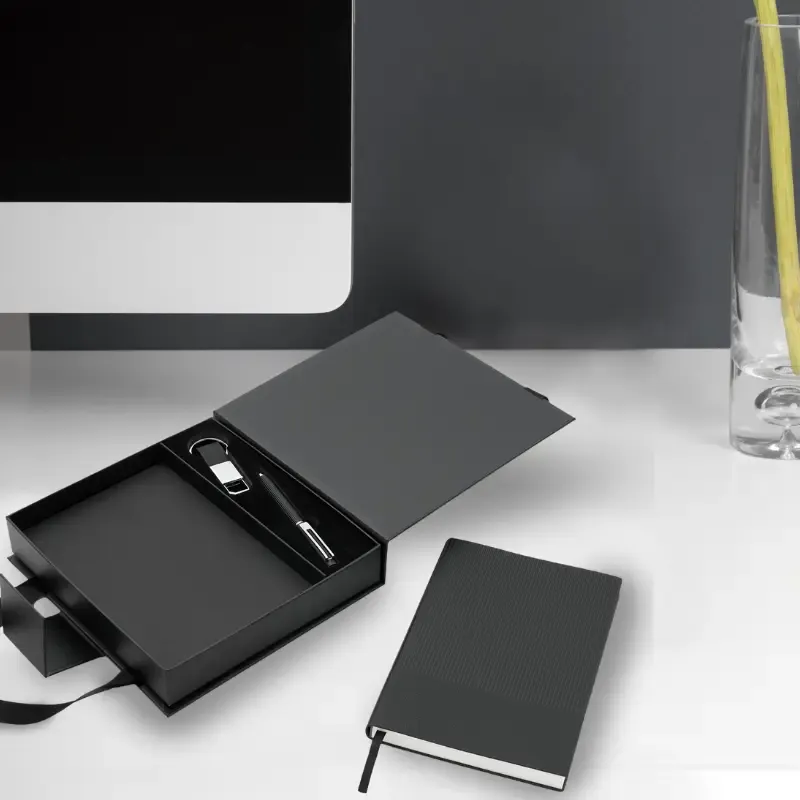 Elegante set que incluye un cuaderno A5 rayado de PU (80 g, 100 hojas, 21 x 14 cm), un bolígrafo de tinta azul y un llavero, todo presentado en una caja de papel kraft negro con acabado mate, que incluye tiras de cinta de raso para facilitar su transporte. Es un producto ideal para regalar en eventos corporativos o fechas especiales.