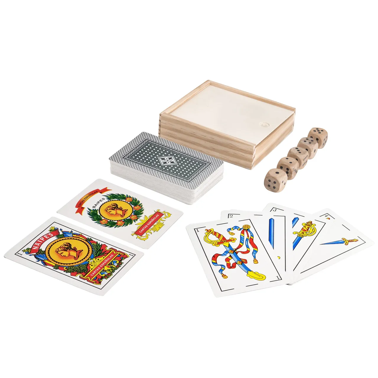 Pequeño set, grandes momentos.Set de entretenimiento. Incluye: 1 juego de cartas españolas plastificadas y 5 dados de madera de cerezo. Caja contenedora de madera de pino y tapa en polywood. Medidas: 10 x 9,4 x 2,5 cm.