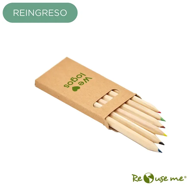 Set de 6 lápices mini de colores. Mina de 2mm. Realizado en madera de pino y Cardboard ECO. Incluye caja de cartón reciclado. Medidas: 9 x 4,5 x 0,7 cm. Re use me