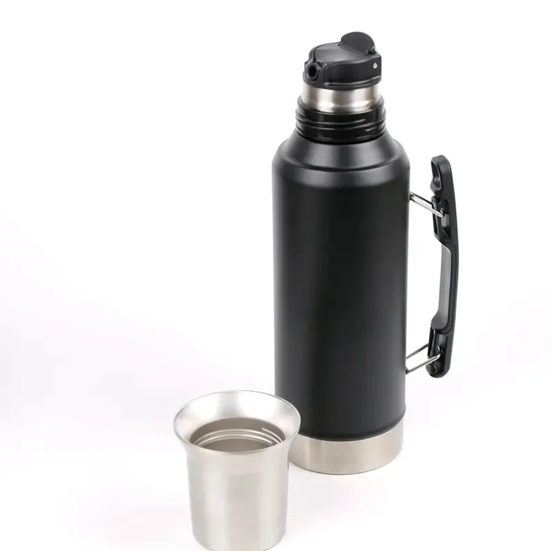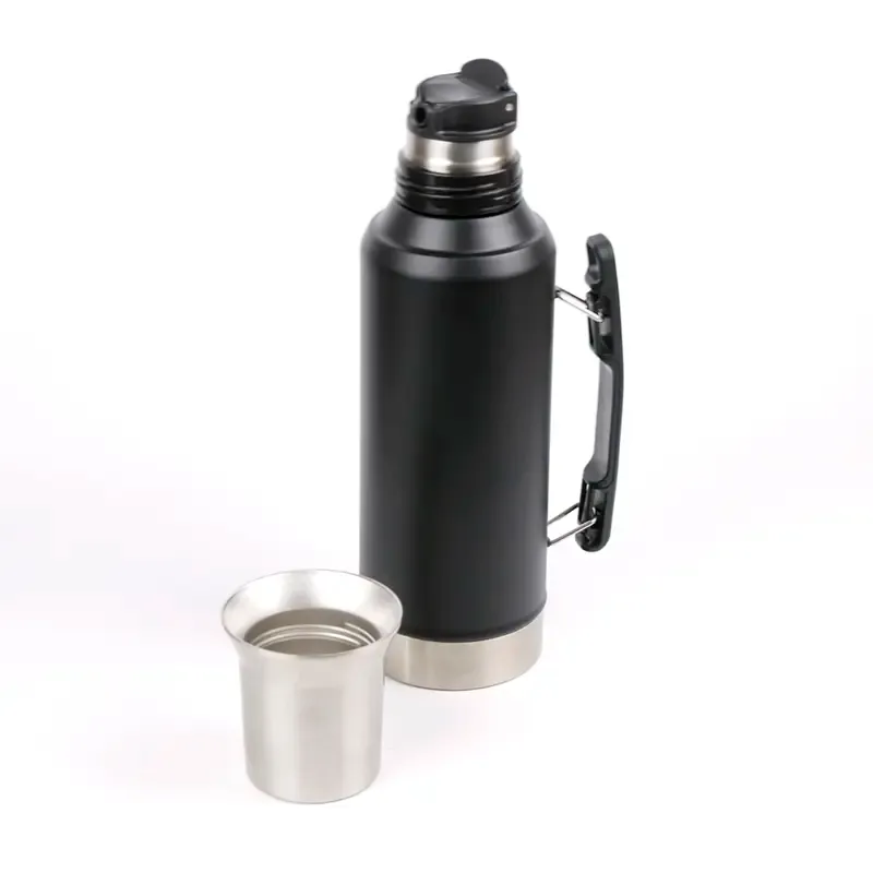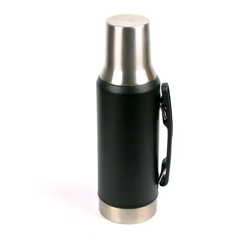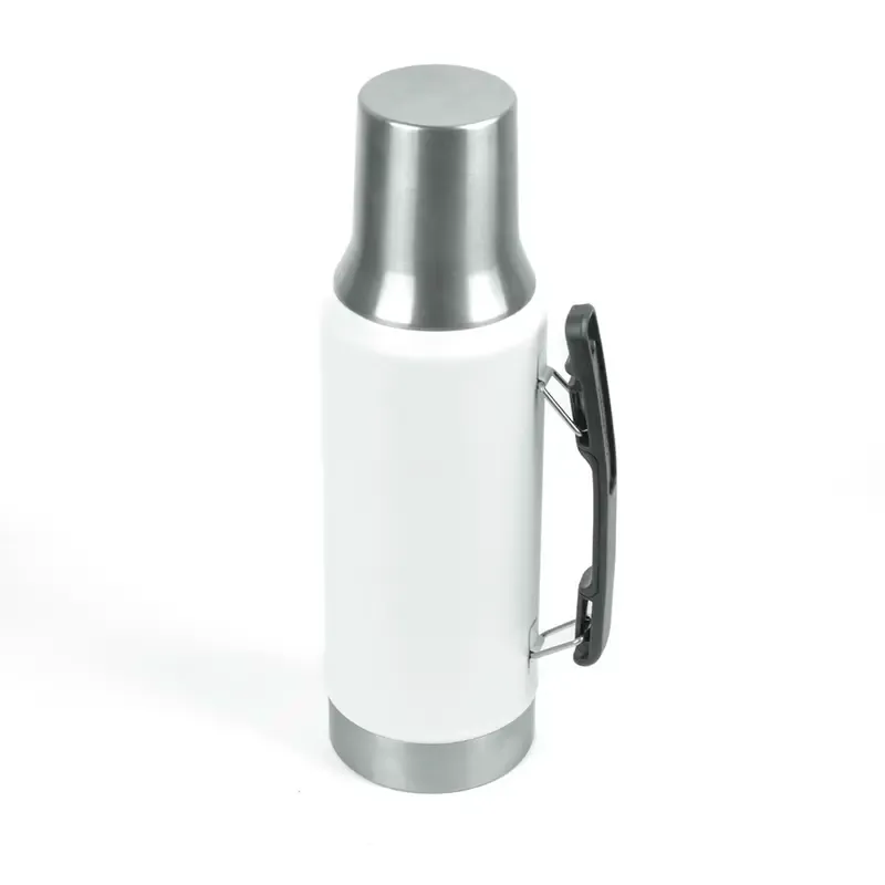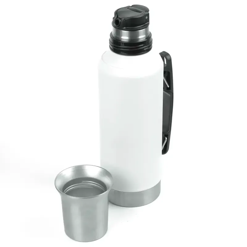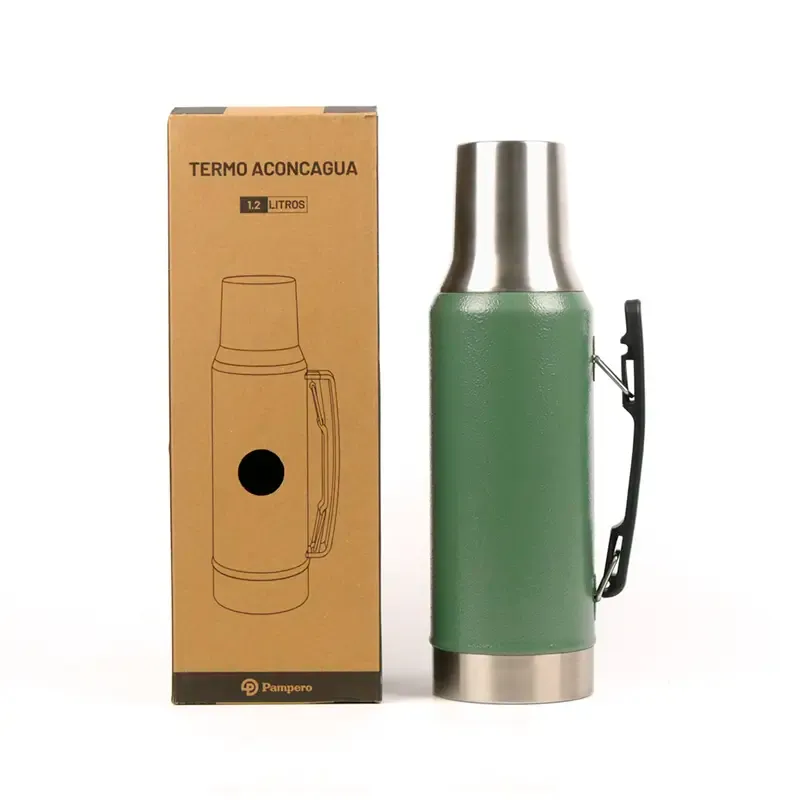 Termo de acero inoxidable con tapa multifunción, fabricado en acero interior 304 y exterior 201. Cuenta con tapa que puede utilizarse como mate, pico cebador, sistema de cierre seguro y asa lateral para un agarre cómodo. Es ideal para mantener bebidas calientes o frías durante largas jornadas de trabajo, actividades al aire libre o viajes, gracias a su capacidad térmica y diseño resistente.